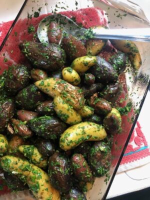Put potatoes in a mixing bowl and fold in 1/2 the chimichurri sauce. Add more to taste. Serve warm. Extra sauce can be stored in the refrigerator and used within 3 days.
