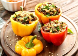Prepare the Bell Peppers: While the quinoa is cooking, cut the tops off the bell peppers and remove the seeds and membranes. Place the peppers in a baking dish, cut side up.