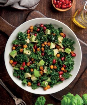 Halve and stone the avocado and cut each half in half again lengthwise. Chop each quarter into three roughly equal pieces. Place in a bowl with the lettuce, red onion and half of the roast chickpeas. Add the dressing and toss to combine. Scatter the remaining roast chickpeas over the top and serve. Top with pomegranate seeds if desired.