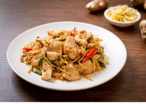 Add remaining avocado oil to the pan set over high heat. Add the fresh ginger and saute 30 seconds, then add the cooked noodles and saute for a few minutes. Add the cooked chicken, the cooked broccoli, green onions, and sesame seeds.