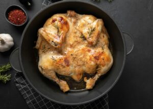 Tip the pan to let the juices flow from the chicken’s cavity into the pan. Transfer the chicken to a platter and let it rest for at least 5 minutes. Carve and serve. Note: for diabetes friendly and heart healthy, remove skin before serving.