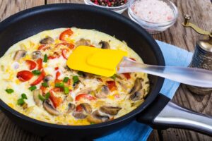 Lightly coat a baking dish, add the mixture and bake in the warm over for 15-20 minutes. After 15 minutes check egg firmness in the middle. Time might varies per pen size and oven functionality.