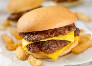 Scrape under the burger with spatula facing down at a 45˚ angle to get under the caramelized part and flip. Cook another 1 minute. Top half of the patties with sliced cheese and cover cheese with the second patty. Repeat with remaining burgers and transfer them to a platter as they finish cooking.