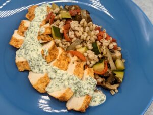 Smoky Spiced Chicken with Creamy Cilantro Sauce with Vegetable Farro