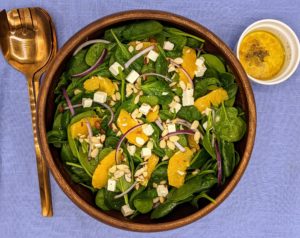 In a large bowl, toss together the spinach, orange segments, and red onion. Drizzle with some of the vinaigrette and toss again.