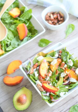 In a large bowl, toss together the spinach, peach slices, avocado, and red onion. Drizzle with some of the vinaigrette and toss again.