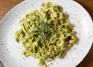 Pasta is tossed with a traditional pesto and pieces of flavorful chopped bacon.