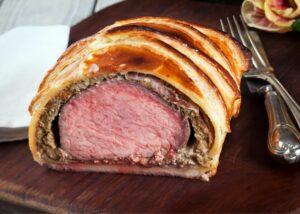 Center cut beef tenderloin is covered with a mushroom duxelles and prosciutto, then wrapped in puff pastry and baked until golden brown. Served with Green Peppercorn Sauce. Perfect for any special occasion! Note: This special dish requires a considerable amount of time, so please plan appropriately.