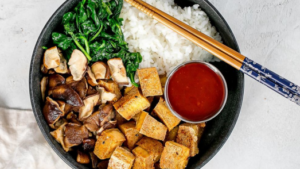 Divide the rice, tofu, and vegetables into a bowl. Drizzle the sauce over everything.