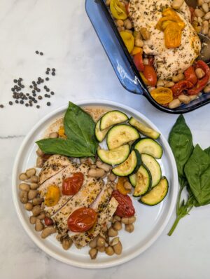 Tomato Basil Baked Chicken with Garlic White Beans and Zucchini