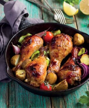 Add the chicken and the remaining turmeric to a large mixing bowl and toss to coat. Transfer the chicken legs to the baking dish and nestle in the beet mixture.
