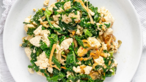 Reduce the heat to medium and add the tamari and kale. Cook until soft, about three to five minutes. Turn the heat off.