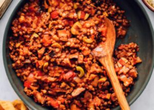Then add drained lentils, oregano, cumin, cayenne (optional), salt and pepper, tomato sauce, water, olives, and raisins(optional). Stir to combine and simmer(covered) for 10-15 minutes, stirring occasionally, to develop flavors.