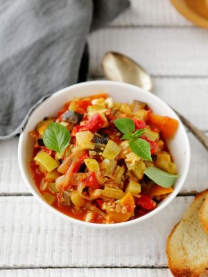 This colorful ratatouille is an excellent way of transforming simple fresh tomatoes, bell peppers, eggplant, and squashes into a flavorful and elegant French dish that is loved by all who eat it. It is hearty, flavorful, vegan, gluten-free, oil-free and paleo. Based on Michelle's recipe from Healthier Steps blog.