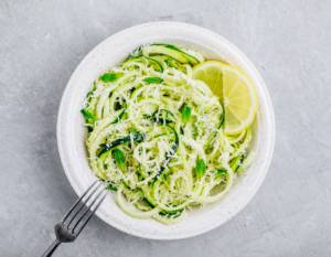 These 5-ingredient vegan parmesan zucchini noodles are full of goodness and flavour, and at under 100 cals a portion, make for a perfectly light and tasty weeknight supper.