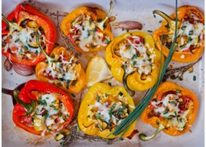 These stuffed peppers aren’t the kind your mom made. They’re meatless and loaded with fresh flavor. They’re cheesy as shown, yes, but they’re just as good without the cheese. You can easily make these peppers dairy free or vegan.