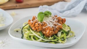 Zoodles topped with a simple-yet-delicious meat sauce simmered with tomatoes, onions, carrots and celery. You'll love this low-carb dish so much that you won't miss the pasta! Based on a Skinnytaste recipe.