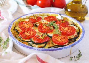 Coat a 2 quart gratin dish or other oven-to-table baking dish with a bit of olive oil. Place half the zucchini in an even layer over the bottom of the dish. Top with half the tomato mixture, then sprinkle with half the parmesan cheese. Make another layer with the remaining zucchini, topping it with the rest of the tomato mixture. Arrange the sliced tomato on top then sprinkle with the the remaining cheese.
